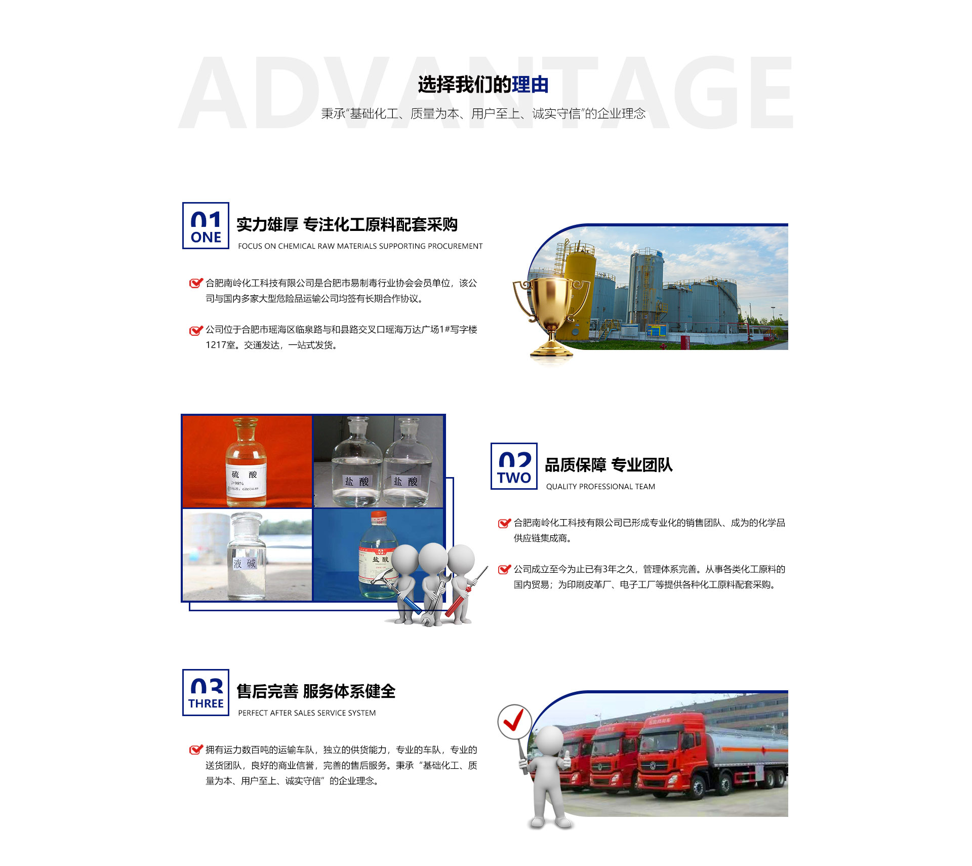 關于我們合肥南嶺化工科技有限公司是合肥市易制毒行業(yè)協(xié)會會員單位,該公司與國內多家大型危險品運輸公司均簽有長期合作協(xié)議,擁有運力數(shù)百噸的運輸車隊,獨立的供貨能力,良好的車隊運輸,有效的送貨團隊,良好的商業(yè)信譽,完善的售后服務。秉承“基礎化工、質量為本、用戶至上、誠實守信”的企業(yè)理念。從事各類化工原料的國內貿易;為各個化工廠、印刷皮革廠、電子工廠等提供各種化工原料配套采購。目前,公司正朝著以貿易為基礎、以實業(yè)為依托,采購、銷售,內外貿一體化,上下游一體化,具有綜合增值能力和復合競爭能力化工原料供應商。本公司主要經營的產品有:鹽酸、硫酸、液堿、片堿等。合肥南嶺化工科技有限公司已形成服務,售后一體化的團隊、成為的化學品供應鏈集成商。為客戶提供良好的服務及產品,本公司經銷的各種產品不僅在安徽地區(qū)深受用戶好評,而且具有很高的市場占有率,產品行銷各個地區(qū)。
